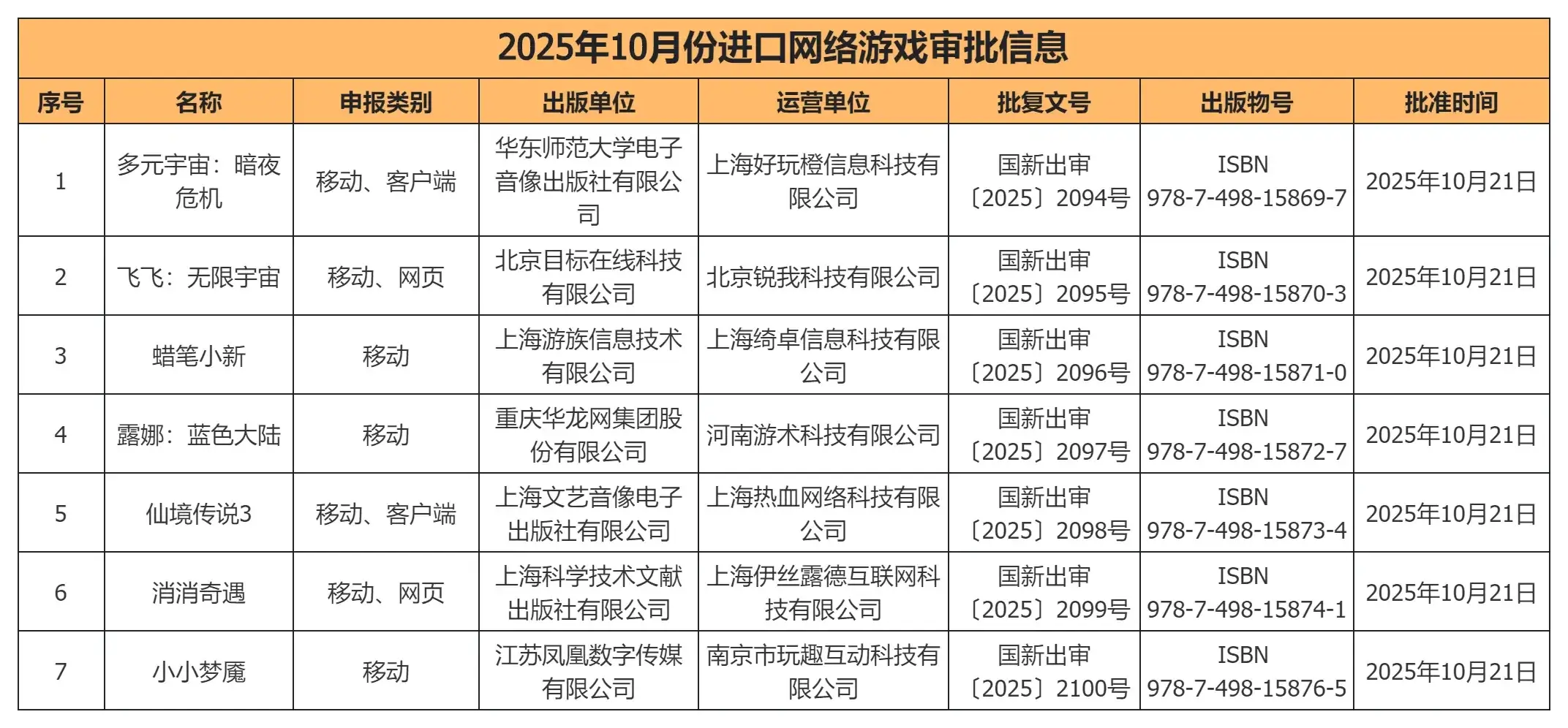 | 近日,国家新闻出版署公布了10月游戏版号审批情况,总计159款国产游戏、7款进口游戏过审,7款游戏变更信息。 其中有多款重点产品过审,鹰角客户端游戏《明日方舟》、FunPlus《太吾绘卷:天幕心帷》、游卡《三国杀正面对决》、中青宝《我叫MT:荣耀护卫队》、4399《冒险启航》、战火互娱《英雄防线》、冰川网络《我要当老祖》、友谊时光《萤火远征》、祖龙《云梦西行》、恺英网络《蓝月英雄》、三七互娱《生存33天》包括等。 |