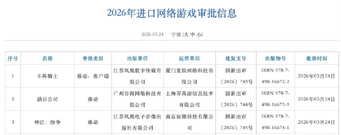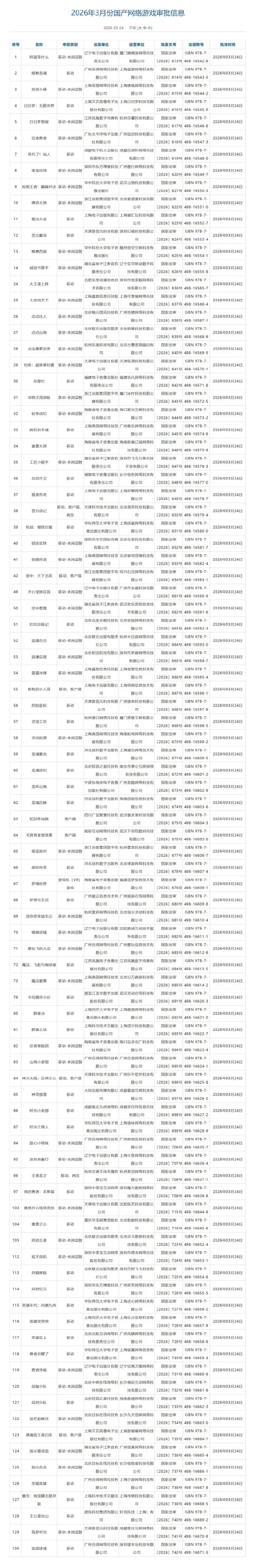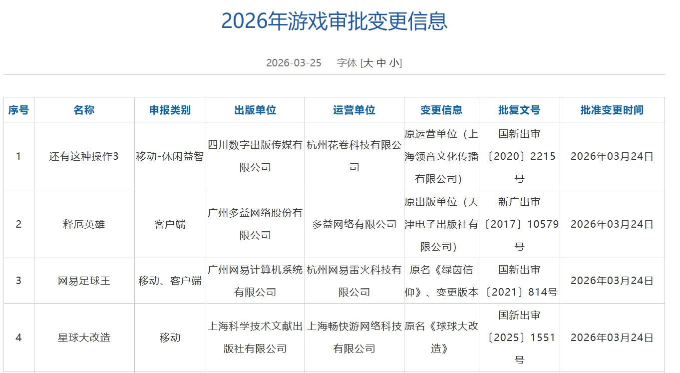3月25日,国家新闻出版署正式发布了最新一期国产网络游戏审批信息。本次共批准130款国产网络游戏及3款进口网络游戏。 本次版号中值得关注的产品有:腾讯游戏旗下休闲社交类产品《粒粒的小人国》、三七互娱的《小头盔大冒险》、恺英网络的《传世群英传》等。 除新发版号外,本期审批信息中还包含4款游戏的变更事项。其中,最受行业关注的变动来自网易。其旗下足球竞技游戏《绿茵信仰》正式获批更名为《网易足球王》。 以下为本期版号过审详细信息: |