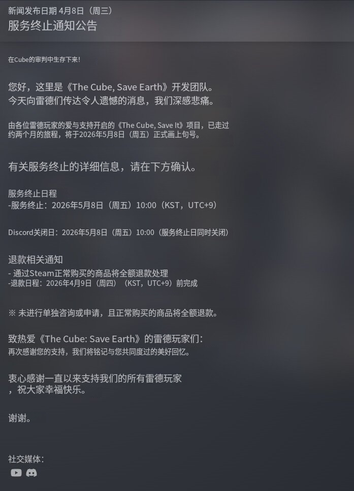 《立方救赎》于3月18日开启抢先体验,讲述了人类在核战后努力求生,试图从外星文明遗留的巨型建筑“魔方”中获取资源并逃离的故事。游戏拥有一个营造末日荒凉氛围的开放世界大厅,每个区域都拥有独特的氛围和机制,并以近距离战斗为核心玩法。 然而,游戏初期表现不稳定,上线后不久便因缺乏易用性、频繁崩溃和漏洞百出而饱受诟病。此外,由于交易所和魔方商店存在滥用问题,付费道具的销售曾两次被暂停。尽管这些问题在4月1日前通过多次补丁修复,但这款游戏在抢先体验版发布仅两个月后便宣告结束运营。 与此同时,XL Games在宣布服务终止的同时表示,计划为通过Steam平台购买《立方救赎》(The Cube, Save Us)游戏内物品的玩家提供全额退款。退款预计将于4月9日完成,所有正常购买的物品都将直接退款,无需另行咨询或申请。有关服务终止和退款的详情,请访问Steam页面。 |